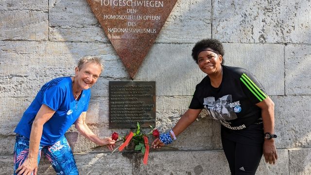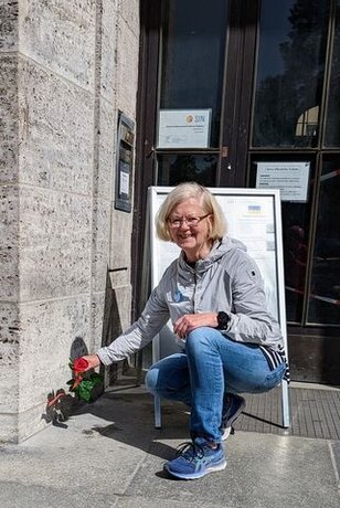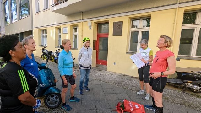 Weiter läuft die Gruppe durch ein morgendlich, sonniges und fast ungewohnt stilles Berlin mitten durch das Kneipenviertel von Schöneberg zum Denkmal für die homosexuellen Opfer des Nationalsozialismus am Nollendorfplatz. Bis zum Beginn der Naziherrschaft gab es in diesem Kiez 52 Lokale, die Treffpunkte für queere Menschen waren und in diesen Lokalen begann Marlene Dietrich ihre weltberühmte Karriere als Schauspielerin und Sängerin. Wir hinterlassen zwei rote Rosen in Erinnerung an die Opfer.